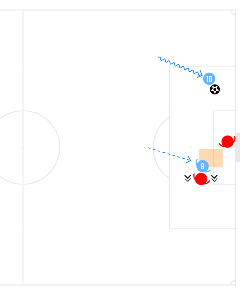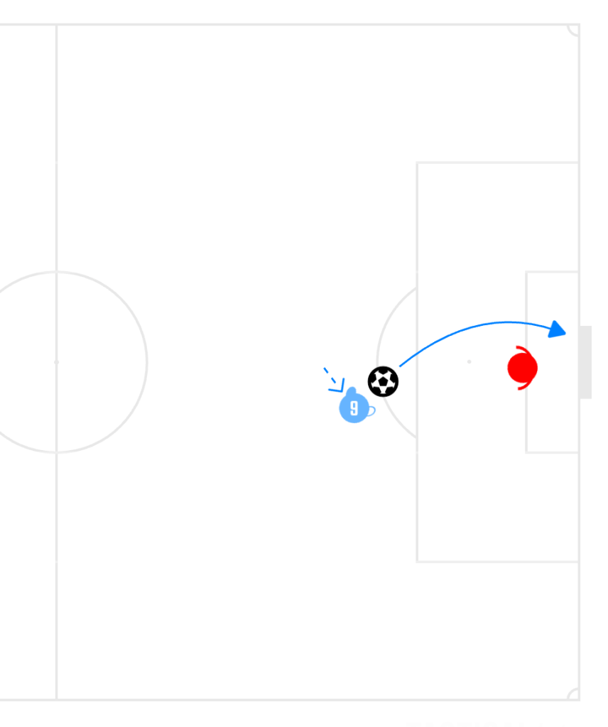 2-2. Maximizing Catchment Area: A linear run to the near post or center limits the ability to adjust to overhit crosses. However, drifting to the far post expands the effective receiving radius, allowing him to attack both short and long deliveries.