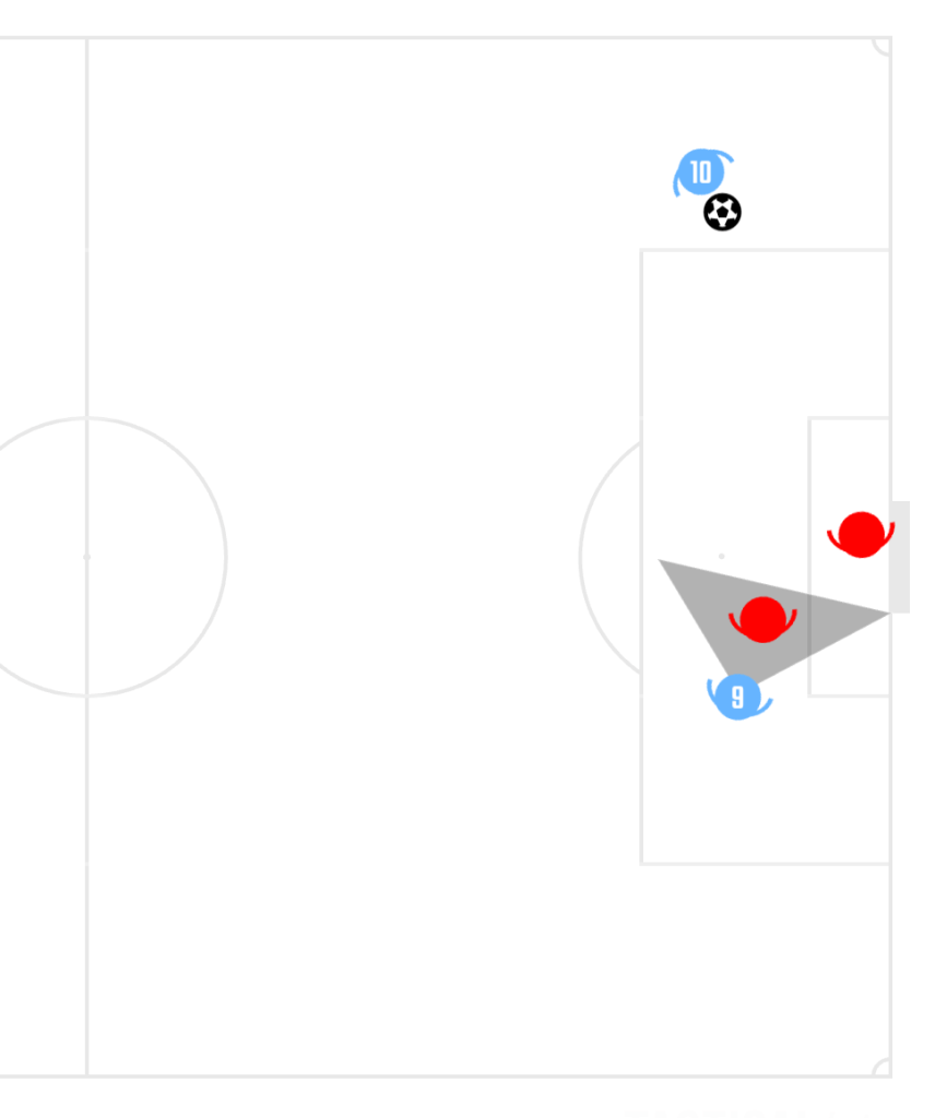 - Visual Occlusion (Blind-Side Exploitation): Research on “Visual Exploration” shows that elite players scan their surroundings 0.6–0.8 times per second. By staying in the defender’s blind side, Haaland forces the defender to lose visual contact, disrupting their OODA Loop (Observe-Orient-Decide-Act) and creating a cognitive delay (Jordet, 2005; Boyd, 1996).